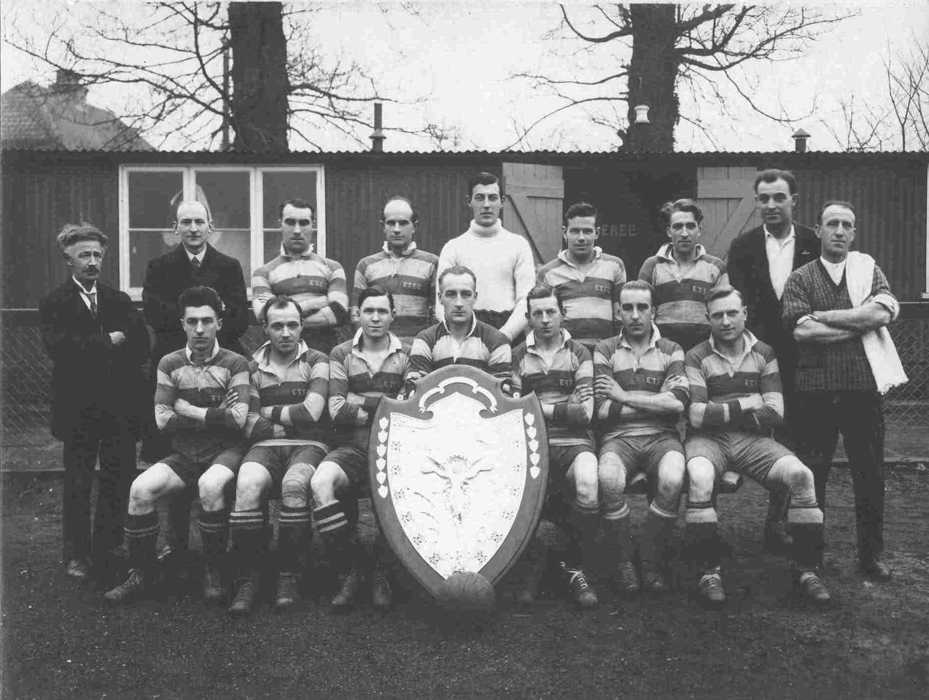 Back Row: Harry Cottee (groundsman), Billy Green (Secretary), GR Stokes, Fred Behn, Ernie Sperring, Wilfred Challis, Jack Parr, A.Puddock (linesman), Tom Kirk (trainer).