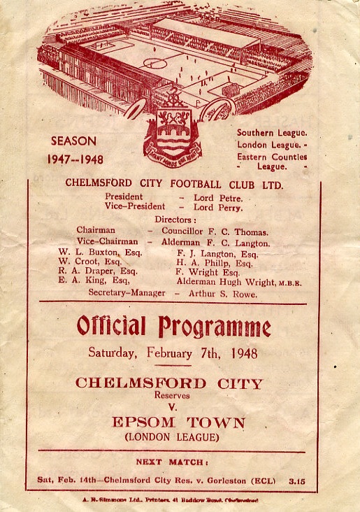 This programme was produced on the day that Epsom F.C. suffered their record defeat on 7th February 1948 when they lost 14-0 in front of 2,789 at Chelmsford City Reserves.