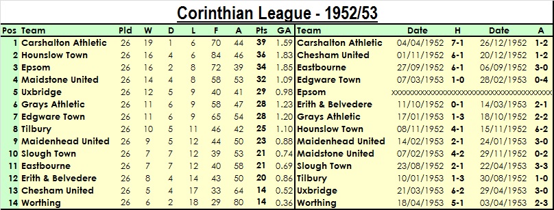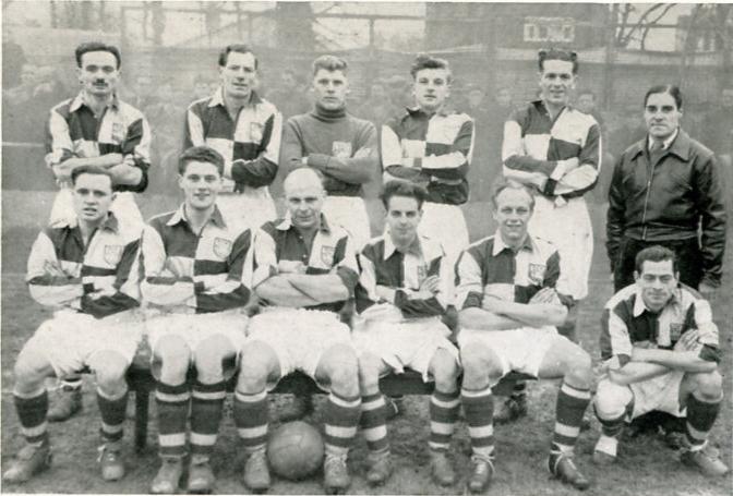 Epsom F.C. line up at West Street on either 8th or 22nd of November 1952. This team photo was released as a Christmas card that accompanied the Camberley F.C. Surrey Senior Cup programme of 3rd January 1953.