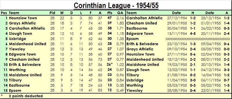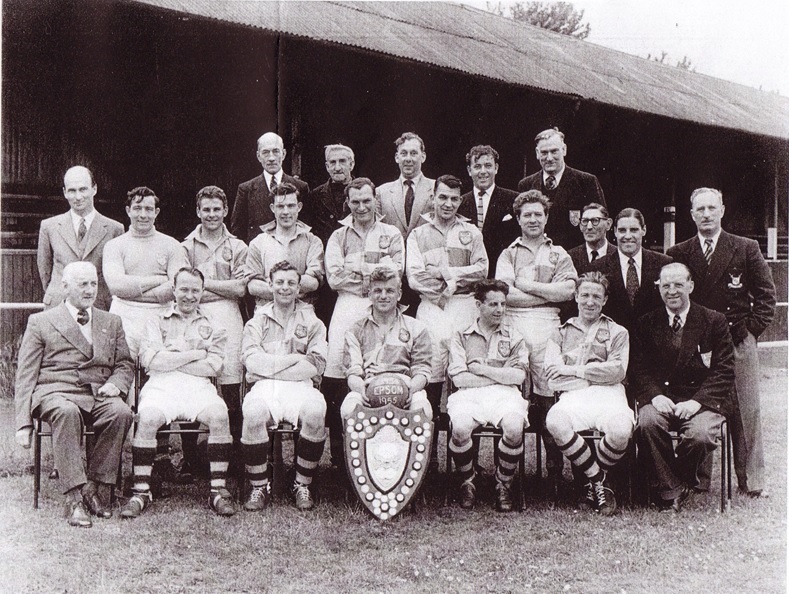 Epsom F.C. line up on 14th May 1955 at West Street with the Surrey Senior Shield that they won that day by a goal to nil against Carshalton Athletic.