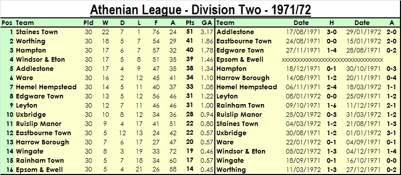Not a great photo as Epsom & Ewell line up before their Southern Combination Cup tie against Egham Town who won 3-1 at West Street on 23rd October 1971.