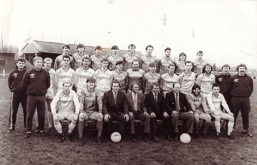 Epsom & Ewell line up for a First and Reserve team photo to commemmorate the new sponsorship deal with Tarbot Computer Services on 27th February 1988.