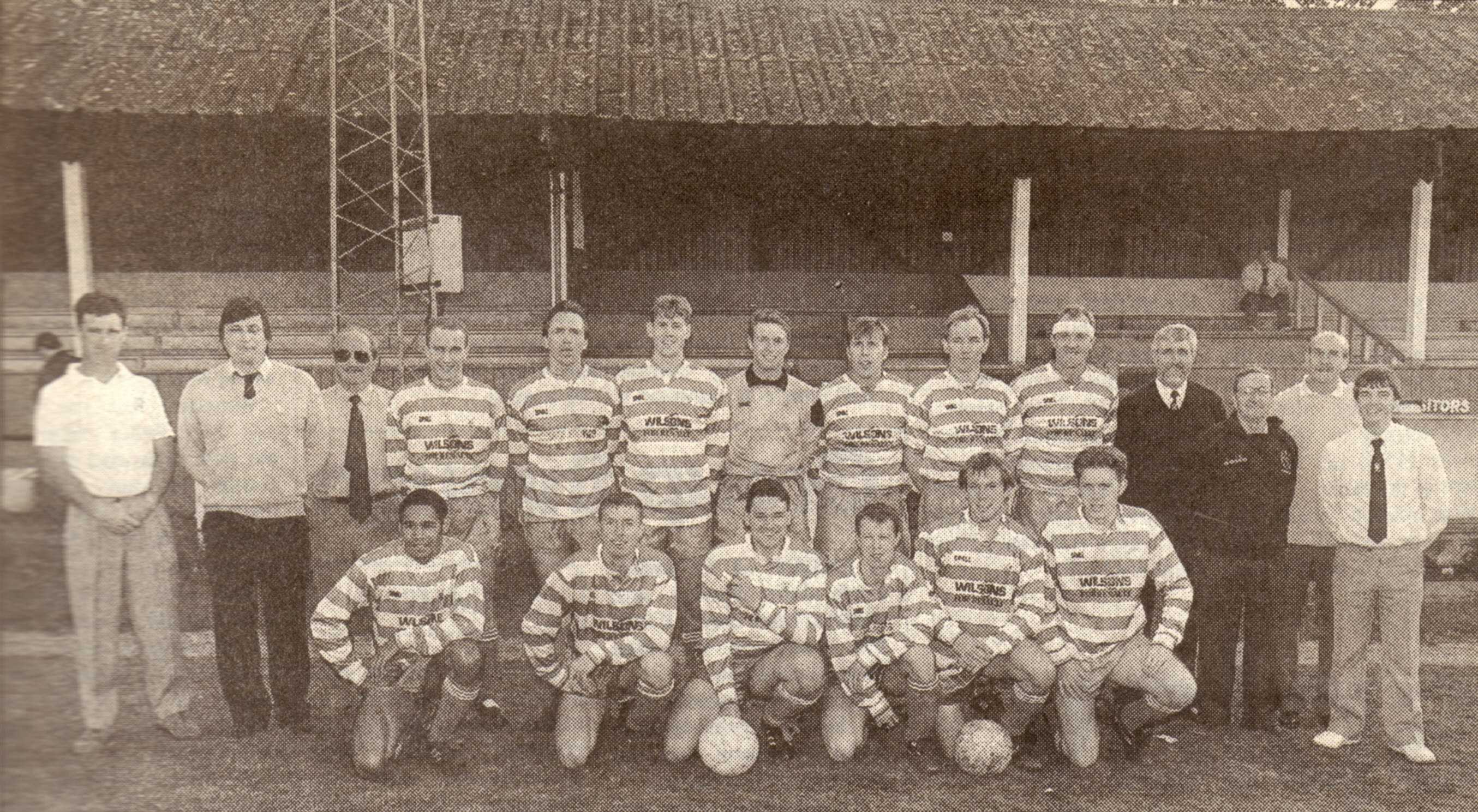 Standing: Glen Connett (Committee), Dave Wilson (Secretary), Peter Smith (Director), Andy Nimmo, Tim Tweedy, Dean Meyer (sub), Tony Webb, Graham Morris, Ray Purvis, Richard Strong, Adrian Hill (Manager), Charlie Millard (physio), John Wood (Asst Manager), Peter Atkins (Chairman)