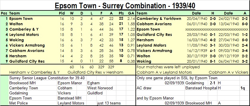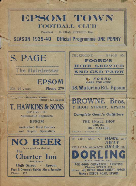Epsom Town won this match at West Street by two goals to one, but the declaration of World War Two twenty-four hours later ensured that it would be the only Surrey Senior League match they would ever play!