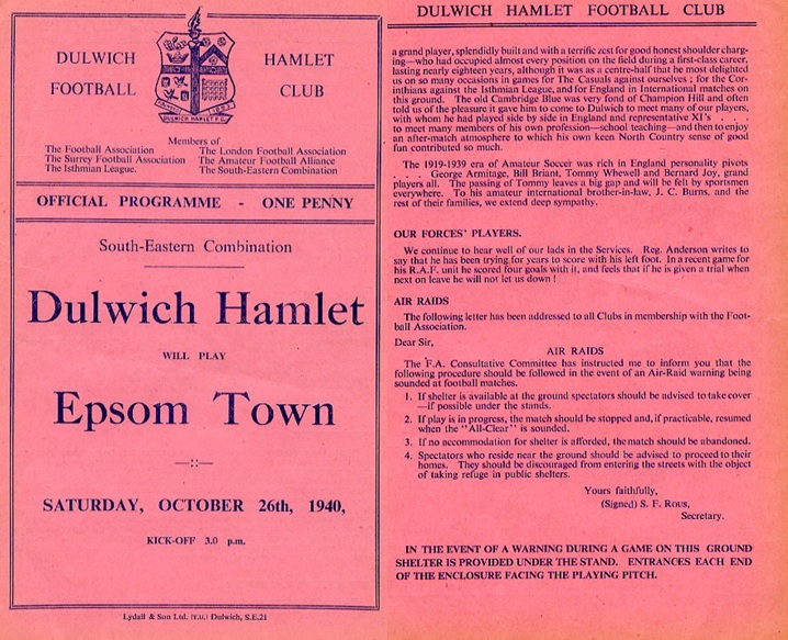 This is a Dulwich Hamlet v Epsom Town match programme from Saturday 26th October 1940 played at Champion Hill.