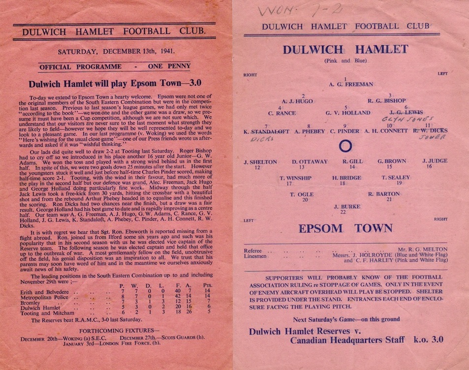This is a Dulwich Hamlet v Epsom Town single sheet match programme from Saturday 13th December 1941 played at Champion Hill.