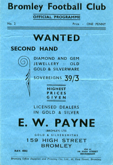 This is a match programme from a South Eastern Combination match at Bromley's Hayes Lane ground on Saturday 23rd September 1944.