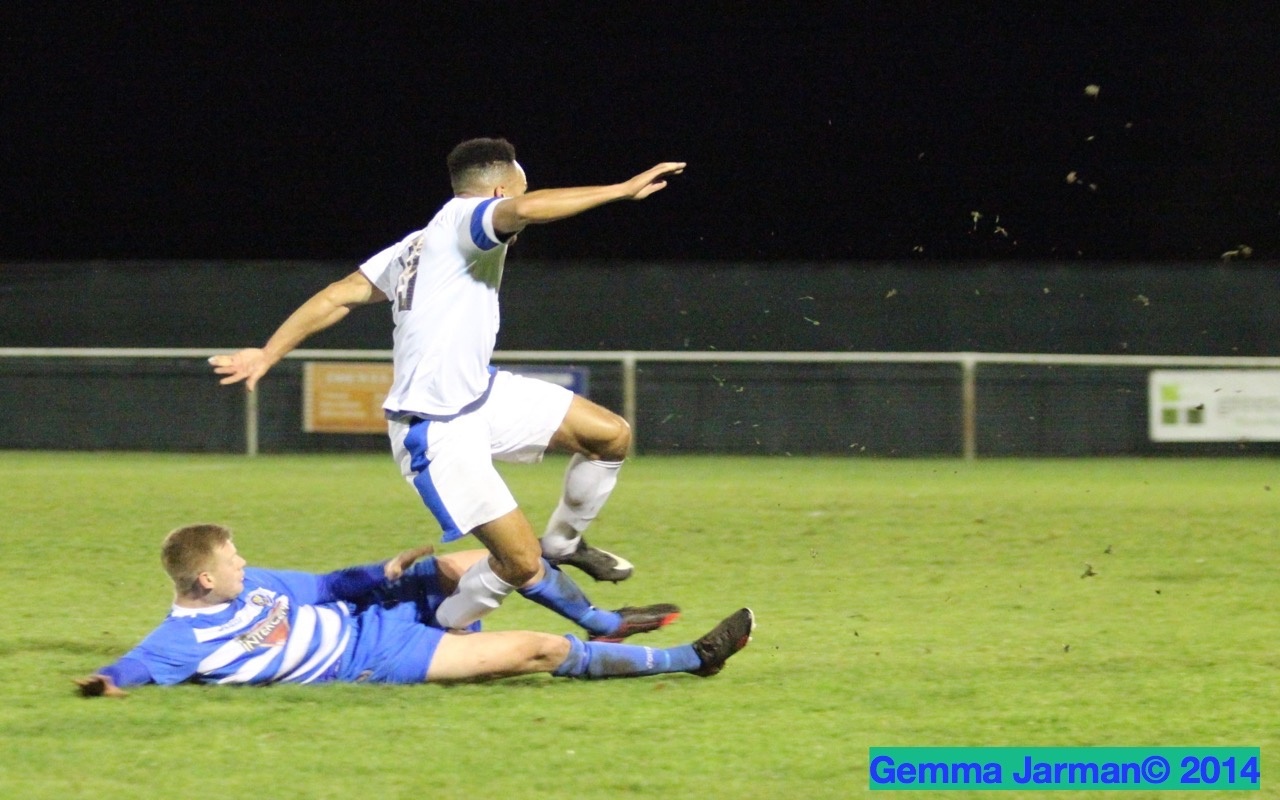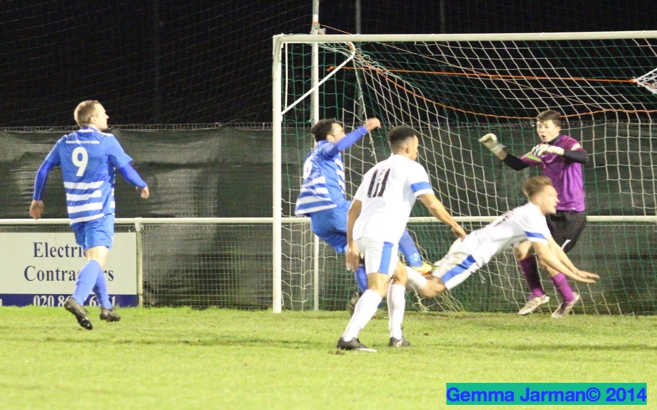 Matt Farrell slams the ball into the net for our opening goal against Spelthorne Sports